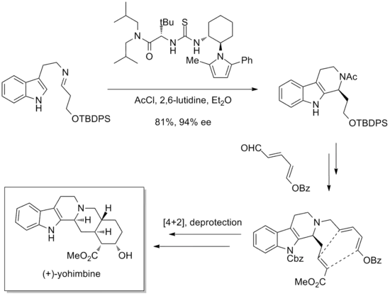 In the Jacobsen synthesis of (+)-yohimbine,[27] an indole alkaloid, an early enantioselective Pictet-Spengler reaction using a pyrrole-substituted thiourea catalyst produced gram-scale quantities of product in 94% ee and 81% yield. The remainder of the synthesis was short, using a reductive amination and an intramolecular Diels-Alder reaction.