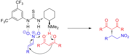 Asymmetric Michael addition to a nitro-olefin by hydrogen bond catalysis developed by Takemoto. The thiourea hydrogen bonds to the nitro group and stabilizes the incoming negative charge, while the amine acts a specific base to activate the nucleophile. This is an example of bifunctional catalysis.