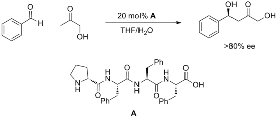 A relatively new strategy of using synthetic oligopeptides to perform catalysis has yielded many successful examples of catalytic methods.[20] Peptides feature multiple potential sites for hydrogen bonding and it is generally not understood how these engage substrate or how they promote reaction. Peptides have the advantage of being extremely modular and often these catalysts are screened in large arrays. Highly enantioselective reactions have been discovered in this manner such as the aldol reaction depicted below.