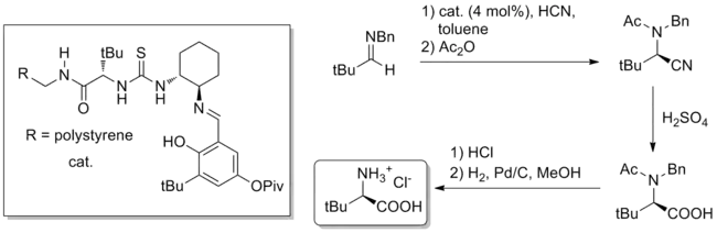 Aside from total synthesis, a potentially useful application of hydrogen-bond catalysis is the bulk synthesis of difficult-to-access chiral small molecules. A notable example is the gram-scale Strecker synthesis of unnatural amino acids using thiourea catalysis, reported in the journal Nature in 2009.[29] The catalyst, whether polymer-bound or homogeneous, is derived from natural tert-leucine and can catalyze (4 mol% catalyst loading) the formation of the Strecker product from benzhydryl amines and aqueous HCN. Hydrolysis of the nitrile and deprotections produces pure unnatural tert-leucine in 84% overall yield and 99% ee.