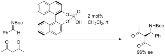 Asymmetric catalysis involving nearly complete protonation of substrate has been effective in Mannich reactions of aromatic aldimines with carbon nucleophiles.[15] In addition, aza-Friedel-Crafts reactions of furans, amidoalkylations of diazocarbonyl compounds, asymmetric hydrophosphonylation of aldimines and transfer hydrogenations have also been reported.[3] Chiral Brønsted acids are often easily prepared from chiral alcohols such as BINOLs, and many are already present in the literature due to their established utility in molecular recognition research.[16]