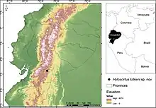 Map showing the type locality of Hyloscirtus tolkieni at the Río Negro-Sopladora National Park, province of Morona Santiago, Ecuador.