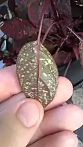 Growing to 30 cm (12 in) tall and broad, it is an evergreen shrub with leaves heavily-spotted pink or white, as if sprayed with paint. This small shrub with green foliage stained with pink-purple dots forms bushy and compact tufts. The leaves are opposite, oval and pointed. They are borne by petioles of 2 to 4 cm 1. The most common type has green leaves with pink spots, although it can range from white to any shade of pink to red. The spots on the undersides of the leaves are far lighter in color, often white.