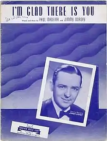 The song has since been recorded by numerous artists.[5][6][7] "I'm Glad There is You" has been covered by Frank Sinatra, Carmen McRae, Ella Fitzgerald, Lena Horne, Ginny Simms, Adam Jackson, Stan Kenton, Mel Tormé, Tony Bennett, Grover Washington, Jr., Paul Anka, Polly Bergen, Gene Ammons, Alvino Rey, Chris Connor, Jamie Cullum, Anita Kerr Singers, Arthur Prysock, Lillie Kae, Chet Baker, Sarah Vaughan, Mildred Bailey, Ray Anthony, Dorothy Squires, Shirley Bassey, Jack Jones, Smokey Robinson, Johnny Mathis, Robert Goulet, Meredith MacRae, Joe Pass, the New Glenn Miller Orchestra under Ray McKinley, Connie Francis, Natalie Cole, Johnny Hartman, Julie London, Jackie Gleason, Cannonball Adderley, Rosemary Clooney, The Temptations, Toni Tennille, The Lettermen, Dick Hyman, Chris Montez, Boots Randolph, Nancy LaMott, June Christy, Duke Pearson Trio, Wesla Whitfield, Helen Carr, Sheila Guyse, Don Cherry, Jane Monheit, Randy Crawford, Matt Monro, The Four Freshmen, Sammy Davis, Jr., Dorothy Dandridge, Hazel Scott, Art Garfunkel, Stan Kenton, Oscar Peterson, Barney Kessel, Kenny Burrell, Rahsaan Roland Kirk, Stan Getz, Peggy Lee, Gloria Lynne, Vic Damone, Freddy Cole, Jean Laughlin, Tommy Joy, Jamie Cullum, Charlie Watts, Beyoncé Knowles, Rachael MacFarlane, Seth MacFarlane, Claire Martin and Eugene Chadbourne with Paul Lovens.