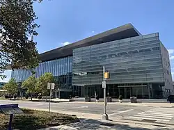 The IUPUI Campus Center is located at the geographic center of the campus on the corner of W. Michigan Street and University Boulevard. The building is the focal point of the campus, with a large distinguishable modern clock tower. Exterior materials include limestone at the Vermont and Michigan Street facades, with large expanses of glass facing University Boulevard. Brick and metal were used for subsidiary facades and structural detailing.[14] The main façade is a four-story glass curtain wall. A three-story glass cube projects forward from the main façade at the northeast corner which contains the campus bookstore. The southeast corner contains a concrete and steel tower, which serves as a clock tower.[15]