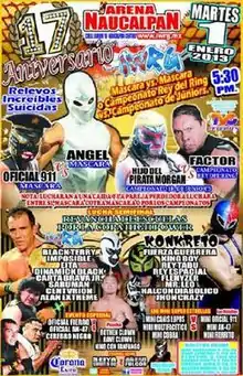 The IWRG 17th Anniversary Show was an annual professional wrestling major event produced by Mexican professional wrestling promotion International Wrestling Revolution Group (IWRG), which took place on January 1, 2013 in Arena Naucalpan, Naucalpan, State of Mexico, Mexico. The main event was a lucha libre special stipulation match, the Relevos Suicidas Tag Team match. In a Relevos Suicida match the first two wrestlers pinned are forced to wrestle against each other with a wager on the line. In the main event the teams consisted of rivals Oficial 911 and El Ángel teaming up to take on Oficial Factor and Hijo de Pirata Morgan who had been rivals as well. Each wrestler would risk something in case they lost; 911 would risk his wrestling mask, El Angel the IWRG Intercontinental Middleweight Championship, Factor risked the IWRG Rey del Ring Championship and Hijo de Pirata Morgan would risk the IWRG Junior de Juniors Championship if he was pinned in the tag team match. On the under card a team representing IWRG's Naucalpan based wrestling school (Alan Extreme, Black Terry, Carta Brava, Jr., Dinamic Black, Eita, Golden Magic, Imposible and Saruman) facing a team representing Fuerza Guerrera's Gimnasio Konkreto (Guerrera, Arana de Plata, Fleeyzer, John Crazy, King Boy, Mr. Leo, Rey Espacial and Rey Tabu). The show featured three additional matches.