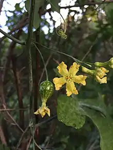 On the shoots are the leaves, which are twice 3-cleft, colored bright green and lacking leaf glands. The dioecious flowers always appear with leaves, the male flowers in racemes and the female flowers solitary. The flowers open early in the morning, after dawn, and close in the afternoon. The petals are yellow. The fruits of the plant are about 1.25 inches (3.2 cm) to 1.5 inches (3.8 cm) long, and colored reddish to orange, "amber colored."[1][4]