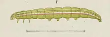 The full grown larva is about 1+34 inch in length, much attenuated posteriorly, pale reddish-ochreous, with numerous fine wavy darker lines; the subdorsal and lateral lines are straight and much more conspicuous; the spiracles are black, and there is a dark olive-green line down the midback.[6]