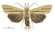 Ichneutica sulcana, the dark underwing wainscot, is a moth of the family Noctuidae.[1] It is endemic to New Zealand and can be found throughout the North, South and Stewart Islands at a range of altitudes from the lowlands to the alpine zone. This species prefers to live in native grass, shrub and wetland habitats as well as in native forest. The larval host plants of this species are forest grasses and sedges and larvae have been reared on Microlaena avenacea and species within the genus Carex. The larva pupates in the soil. Adults are on the wing from December to May but have also been recorded in August and September in the northern parts of the North Island. They are attracted to sugar traps as well as to light. I. sulcana and I. supersulcana are very similar in appearance but can be distinguished as there are differences in the male abdomen and genitalia of the two species. Also these two species do not appear to share a range as I. supersulcana seems to prefer to live at higher altitudes than I. sulcana. I. sulcana might also be confused with I. semivittata but I. sulcana is a larger species with a much darker abdomen and hindwing, and has only 1 to 3 dots on the forewing postmedian line.
