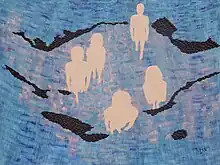 “The Thing” series, oil and cocoons on canvas, also border between abstraction and figuration, but Kubler used boldly the impasto technique. The painterly imagery is sublime: half-abstract groups of nudes walking in the nothingness.[5]
