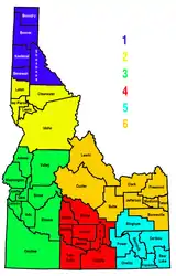 The Idaho State Police is divided geographically into six districts, with headquarters (and training facility) in Meridian, west of Boise. District offices (1–3) are located in Coeur d'Alene, Lewiston, and Meridian. District offices (4–6) are located in Jerome, Pocatello, and Idaho Falls.[6] Each district has a different captain and command staff, are managed separately and are overseen by a major. Each district has two divisions; patrol and investigations.