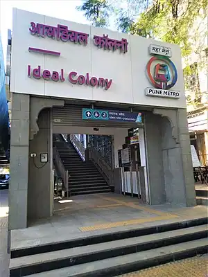 Ideal Colony is an elevated metro station on the East-West corridor of the Aqua Line of Pune Metro in Pune, India. The station was opened on 6 March 2022 as an inauguration of Pune Metro and was the first to be completed.[1] From March 2022 to August 2023, the Aqua Line was operational between Vanaz and Garware College.[2] The extended section between Garware College to Ruby Hall Clinic was inaugurated on 1 August 2023. So the metro currently runs from Vanaz to Ruby Hall Clinic.[3]