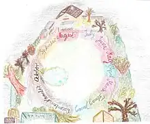 A drawing by a synesthete which illustrates time unit-space synesthesia/ideasthesia. The months in a year are organized into a circle surrounding the synesthete's body, each month having a fixed location in space and a unique color.