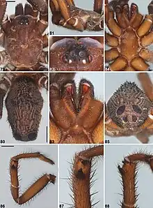 - 1 2 Michael G. Rix; Joel A. Huey; Steven J.B. Cooper; Andrew D. Austin; Mark S. Harvey (2018). "Conservation systematics of the shield-backed trapdoor spiders of the nigrum-group (Mygalomorphae, Idiopidae, Idiosoma): integrative taxonomy reveals a diverse and threatened fauna from south-western Australia". ZooKeys. 756 (756): 1-121 [25, Figs 14, 15, 25, 79–100]. doi:10.3897/ZOOKEYS.756.24397. ISSN 1313-2989. PMC 5956031. PMID 29773959. Wikidata Q54802958.