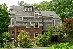 "Idlewild" is constructed with a stone basement and brick first floor. The upper floors are framed in wood and clad with cedar shingles. It has a wrap-around covered porch, high-ceilinged rooms, and an irregular roofline with variously shaped windows and eyebrow dormers. Furness placed the service rooms and front and back stairs (with a shared landing, as at the Emlen Physick House) at the front. This increases the privacy of the rooms behind, and the visual interplay between the differing scales of the "service tower" and main house gives vibrancy to the façade.[2] The "chronic eccentricity" of his ornament in other buildings is "rather restrained" here.[3] But the complex façade both expresses function[4] and presents the viewer with a puzzle to decipher.