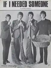 Harrison likened "If I Needed Someone" to "a million other songs" that are based on a guitarist's finger movements around the D major chord.[22][nb 3] The song is founded on a riff played on a Rickenbacker 360/12,[24][25] which was the twelve-string electric guitar that McGuinn had adopted as the Byrds' signature instrument after seeing Harrison playing one in A Hard Day's Night.[26][27] When McGuinn told him this in Los Angeles, Harrison was appreciative of the recognition, particularly as his contributions to the Beatles were often overshadowed by those of Lennon and Paul McCartney.[28] In late 1965, Harrison acknowledged the Byrds' influence on "If I Needed Someone" when he sent a copy of the Beatles' new album, Rubber Soul, along with a message for McGuinn and Crosby,[29] to Derek Taylor, the Byrds' publicist.[30][31] In his note, Harrison said that the riff was based on the one McGuinn had played on the Byrds' adaptation of "The Bells of Rhymney",[32] and that the rhythm was based on the drum part in "She Don't Care About Time".[33][nb 4] McGuinn later recalled: "George was very open about it. He sent [the record] to us in advance and said, 'This is for Jim' – because of that lick [in 'The Bells of Rhymney']."[5][37]