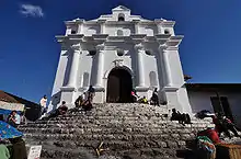 The Iglesia de Santo Tomás is a Roman Catholic church in Chichicastenango, Guatemala. It is located in the market place of the town which is known for its pottery and contains the Chichicastenango Regional Museum. It was built around 1545 atop a Pre-Columbian temple platform, and the steps originally leading to a temple of the pre-Hispanic Maya civilization remain venerated. K'iche' Maya priests still use the church for their rituals, burning incense and candles. Each of the 18 stairs that lead up to the church stands for one month of the Maya calendar year. Another key element of Chichicastenango is the Cofradia of Pascual Abaj, which is an ancient carved stone venerated nearby and the Maya priests perform several rituals there. Writing on the stone records the doings of a king named Tohil (Fate).[1]