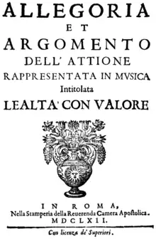"Allegory and subject of the action performed in music, entitled Lealtà con valore", title-page of the scenario booklet (not properly a libretto), Rome, 1642 (misprinted as 1662)[1]
