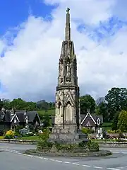 A conspicuous landmark is the Grade II* listed Mary Watts-Russell Memorial Cross; Mary was the wife of Jesse Watts-Russell. Standing as a roundabout at the road junction where a lane branches off towards Blore, this is an ornate gothic-style obelisk of local limestone in the style of an Eleanor Cross. Standing on a three-step plinth, it has two tiers of statues surmounted by a spire with a cross at the top. In style, it bears some resemblance to the decorated facade of Lichfield Cathedral.[15]