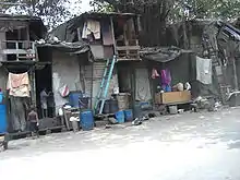 Huts or shanties built on illegal land are sometimes assembled with brick and concrete, but often made with cardboard, tin and plastic. Hut communities, or slums, may be managed by slum lords, which may have access to water, but rarely sewer facilities.[17] The term "slum" does not in all cases mean that the community is an illegal one; some slums are legal housing communities.[18]