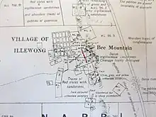 A settlement, including a store, had developed at Bee Mountain, by the end of 1904,[12] and a post office opened there in 1905.[13] The village named Illewong was proclaimed on 18 April 1906.[2] In September 1906, the existing post office, named Bee Mountain, was renamed Illewong.[13] The village was associated with the Queen Bee Copper Mine,[14] and to its south the Queen Bee South,[15] amongst others in the surrounding area.[16] Always a small village, Illewong could nonetheless support sporting teams, even a rifle club. The village had a school from April 1905 to May 1916.[17]