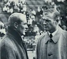 On October 24, 1925, Michigan defeated Illinois, 3–0, in Champaign. The victory came as Illinois celebrated homecoming in front of a record crowd of 67,000 at Memorial Stadium. Stopping Red Grange was considered to be the key to beating Illinois in 1925.[23] During the pre-season practice sessions, Michigan's line coach Tad Wieman dressed a player in a sweater with Grange's number and sent his guards and tackles "after the mythical Grange with instructions to 'hit him hard.'"[24] Before the game, Michigan coach Fielding H. Yost told reporters: "One of the greatest throngs in all football history is here. For weeks the game has been on every tongue. . . . Our players have been compared as to weight, speed, and ability. The stage is set."[25]