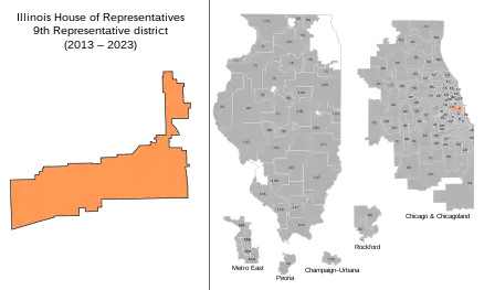 1. 1 2 "STATE LEGISLATIVE DISTRICT REFERENCE MAP (2022): Illinois - State House District 9" (PDF). United States Census Bureau. October 12, 2022. Retrieved January 24, 2023.