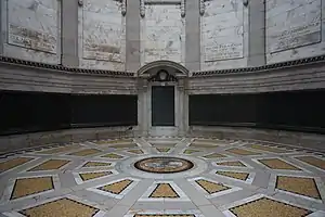 The memorial's design was based on that of the Roman Pantheon.[2][4][1] The base and stairway is made of granite quarried from Stone Mountain in Georgia, while the remainder of the 62-foot (19 m)[3][4] structure is made of Georgia marble.[4] It is the largest memorial on the battlefield.[1] According to the National Park Service, "[n]o device indicative of war" is featured in the memorial, which was specified by the commission that oversaw its creation.[1] Sixty bronze tablets line the interior of the memorial and bear the names of all 36,325 Illinois soldiers who participated in the campaign.[4][2] A bronze statue of a bald eagle, sculpted by Hibbard, sits atop the memorial.[4] It was gilded in the 1990s, along with lettering and other details on the interior.[6] The stairway consists of 47 steps, one for each day of the siege.[1][4] It is located near the Shirley House on the battlefield, along Jackson Road.[1]