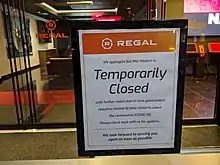 The sign on the door of a closed Regal movie theater in New York City, March 2020; Regal Cinemas reopened most of their theaters on August 21, 2020, re-closed them on October 8, 2020, and has been reopened since April 2, 2021.
