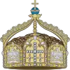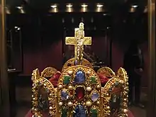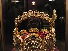 The present red velvet cap on the inside of the crown dates from the 17th century. Before this the imperial crown was worn over a mitre; assuming this had the form of the Byzantine camelaucum, the arch would have caused it to bulge up on both sides, much as the embroidered ribbon from front to back on the eleventh century bishops' mitres caused their linen fabric to bulge up.[1] Thus the Imperial Crown appears to be the earliest form of mitre crowns worn by the Holy Roman Emperors as a sign of their imperial office, the form of which was perpetuated in the crown created for Rudolf II and now known as the Imperial Crown of Austria.