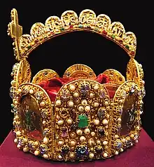 The crown of eight hinged golden plates was probably made in Western Germany for the Imperial coronation of Otto I in 962,[1] with what must be later additions which may have been made for Conrad II (since the arch is inscribed with the name CHVONRADUS). However, some medieval historians argue that the crown may have been commissioned at a later date. Whilst acknolwedging that the crown is "dated most frequently as a work of the second half of the tenth century", John B. Freed states that "the inscriptions on the plaques have been dated for paleographical reasons as no earlier than the second half of the eleventh century", while the biblical verses that appear on three of the four plaques "were first cited in royal charters only in the late eleventh and twelfth centuries", and proposes that the crown was instead made in preparation for the imperial coronation of Conrad III in Rome (although Conrad was ultimately never crowned as emperor). Freed also cites as evidence the title that appears on the crown, which is identical to how Conrad was styled in a "letter he sent in 1142 to the Byzantine emperor" John II Komnenos, and claims that "the selection of the otherwise odd text from Isaiah 38:5 on the Hezekiah plaque makes the most sense if Conrad commissioned the crown", since he had become "seriously ill during the Second Crusade" and was suffering from tertian malaria, which "hindered him [...] from carrying out his responsibilities from the end of August 1149 until April 1150." On the other hand, Reinhard Staats has "interpreted the Isaiah text as a reminder to every monarch that his days were numbered", while Denise A. Kaiser has "argued that Otto II commissioned the crown and that the Hezekiah plaque refers to Otto I's recovery from a serious illness."[2] The first preserved mention of the crown is from the 12th century, assuming (as is probable) that it is the same crown.