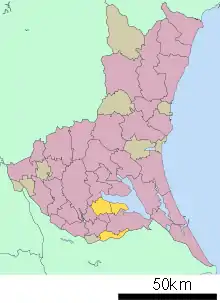 Inashiki District (yellow) in Ibaraki Prefecture. Upper left Ami, upper right Mijo and lower Kawachi.