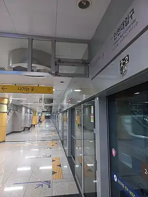 Incheon National University Station is a subway station on Line 1 of the Incheon Subway in Yeonsu-gu, Incheon, South Korea. It has four exits connecting it to Incheon National University, nearby hotels, and the east side of Songdo Central Park.