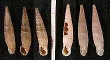 Shell description: The shell is sinistral, with a very slender spire, with nearly straight sides. The shell has 11–12¾ whorls. The uppermost whorls are moderately convex and separated by an indented suture, the lower ones increasingly more flattened and separated by an increasingly more shallow suture. The shell is yellowish brown, with a white sutural line and many prominent white papillae along the adapical border of the whorls. On the upper half of the shell, the papillae may be vaguely lengthened in the regular shell colour by striae that reach at most about the periphery of the shell; only the final quarter of the [body whorl] with irregular radial riblets. Cervical part of the body whorl is with a rounded basal keel, separated by an indentation from a rather prominent dorsal hump.[3]