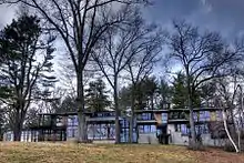 MIT School of Architecture Chair Mark Jarzombek wrote in 2013, "Indian Hill House – in a more restrained clean modernist aesthetic — is different from [Smith's] own house in many respects. A series of low, concrete walls staggered across the crest of the hill rise up to meet wooden, glazed walls of slightly different heights. The whole is protected by shed-and-gable roofs designed to appear as thin and lightweight as possible."[10]