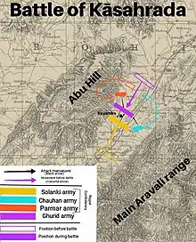 - ↑ Rima Hooja 2006, p. 261:"Muhammad of Ghor advanced against Gujarat in AD 1178, which was then ruled by the Chalukyan ruler Bhima II (?Mularaj II?). The bravery and spirited fight put up by him and his allies (among them Kelhan of Nadol, his younger brother, Kirtipal Chauhan, founder of the Jalore line, and the Parmar ruler of Abu, King Dharavarsha, forced the enemy back from the vicinity of Abu, in Rajasthan. According to the Sundha Inscription, this decisive battle took place at Kasahrada, near Abu."