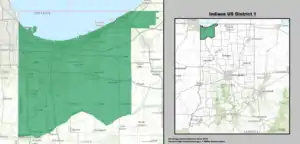 Indiana's 1st congressional district is an electoral district for the U.S. Congress in Northwestern Indiana. The district is based in Gary and its surrounding suburbs and exurbs. It consists of all of Lake and Porter counties, as well as most of the western part La Porte County, on the border with Michigan. Redistricting passed by the Indiana General Assembly in 2011 shifted the district's boundaries, effective January 2013, to include all of Lake and Porter counties and the western and northwestern townships of La Porte County, while moving Benton, Jasper and Newton counties out of the district.
