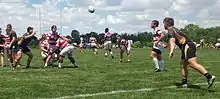 Unlike senior level clubs, which play two forty-minute halves, youth rugby in the United States is capped below the traditional eighty-minute match. In Indiana, matches are scheduled for two thirty-minute halves, with players not allowed to participate in more than ninety minutes of scheduled match time in a single day. In competitions in which teams compete in multiple matches, the total length of the match is truncated to comport with the ninety-minute daily cap, thus, the matches are contested at two halves each of 22.5 minutes in duration. Matches consist of fifteen players on the field for each team along with eight reserves on the bench (23 total).[8] Matches will end in a draw if level at the end of full-time unless in a championship competition. In a championship competition, if the match is level at full-time, an additional ten-minute sudden death period is played. If the match remains level after sudden death, then the outcome is decided on drop kicks. If multiple matches are to be contested in a single day, the sudden death period is foregone.[8] Coed play at the high school level is not permitted.[8] The coed prohibition was tested in May 2001 by the Mishawaka High School boys squads' attempt to include Nicole Kodba in its playoff lineup. Despite arguments from her coach and a community petition, Kodba was not allowed to compete for the boys team.[14] The ruling was controversial and drew critics from among the rugby coaching ranks.[15]