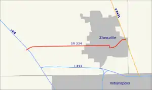 State Road 334 connected Interstate 65 (at exit 130) with U.S. Route 421. Its western terminus was at Indianapolis Road just west of Interstate 65. It passed through the downtown area of Zionsville.