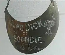 King plates were metallic crescent-shaped plaques worn around the neck which sat across the chest. This chest plate belonged to King Dick of Boondie. A 'boondie' is an Australian term for a sand cake that is carved from, or broken off, a larger, hardened pocket of sand and can be thrown like a snow ball. Boondies are common in Western Queensland.