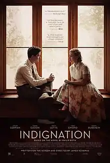 Indignation is a 2016 American drama film written, produced, and directed by James Schamus. The film, based on the 2008 novel of the same name by Philip Roth, is set mostly in Ohio in the early 1950s, and stars Logan Lerman, Sarah Gadon, Tracy Letts, Linda Emond, and Danny Burstein.
