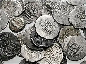 Indo-Sasanian coins derive from three Sasanian prototypes, which were introduced in western India by the Alchon Huns, also called Hunas by the Indians.[1]