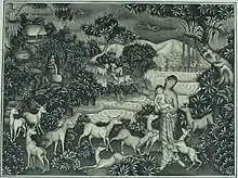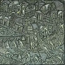 Paintings from the story of the Mahabharata. Drona tried to get rid of Bhima by telling him to meditate on Mount Kailasa