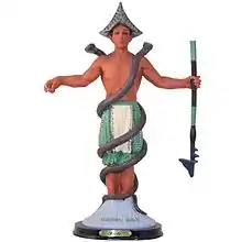 Inle is commonly depicted as a strong, healthy-looking warrior and hunter, with flowing hair in seven braids and fine, feminine features that give him an androgynous appearance. He is always dressed elegantly, adorned in cowrie shells, coral, and beautiful feathers from the birds he hunts, and is often shown with snakes wound around him, recalling the association of snakes with healing as seen in the caduceus and staff of Aesculapius. Inle may also represented holding a staff, dagger, or a fishing hook . In nature, he is represented by fish. His colors are white, yellow, and blue, though some sources say indigo, turquoise, and coral. His sacrificial victims are typically pure white as well.[1]