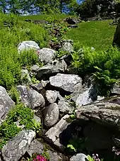 When Marion Beck died in 1959, the management of the garden was transferred to the foundation. It was first directed by Collins, who faced financial difficulties.[1] He dismissed most of the 20 gardeners,[1] removed most of the cup-gardens, planted new trees and added rocks and fountains to enforce a romantic impression. The garden opened to the public in 1960. In 1969, a bridge across the lake was built, and a fog machine was installed to create artificial rainbows. Collins achieved his vision of a landscape around the glacial lake, to make it possible that "a sense of journey is part of the experience".[5] Collins sold a large part of the property to the Rockefeller University in 1972,[1] which created a nature preserve.[5]