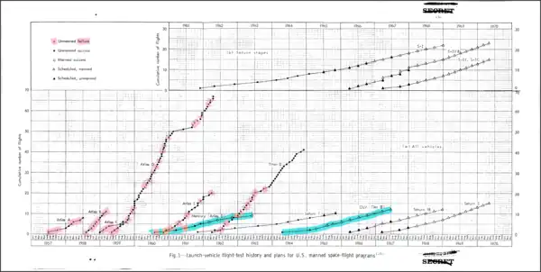 1965 graph of USAF Atlas and Titan ICBM launches, cumulative by month with failures highlighted (pink), showing how NASA's use of ICBM boosters for Projects Mercury and Gemini (blue) served as a visible demonstration of reliability at a time when failure rates had been substantial.