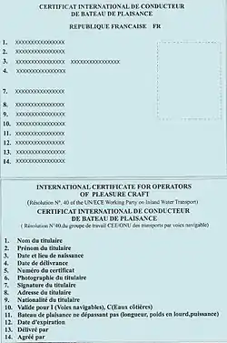 4. "International Certificate (International Card) Concerning the Competence of Pleasure Craft Operators - Resolution No. 14, revised" (PDF). Compendium of resolutions of the Principal Working Party on Inland Water Transport, TRANS/SC.3/131. United Nations Economic Commission for Europe, Inland Transport Committee, Working Party on Inland Water Transport. 29 January 1979. p. 27. Retrieved 2013-11-29.