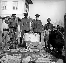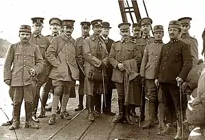 Captain Fabius, Major Kroon, Major De Waal (partly visible), Major Sluys, Captain Doorman, Major Roelfsema, Dr. De Groot (in civilian clothes), Captain Sar, Major Verhulst, Major Snellen van Vollenhoven and, far right, First Lieutenant Mallinckrodt on their arrival in Vlorë on February 24, 1914. The others are Albanian officers.