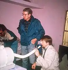 IMCB members (L to R) Ramana Dhara, Jerry Havens, Birger Heinzow calibrate a spirometer Jan 1994