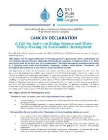 A major outcome of the XVI World Water Congress was IWRA's Cancun Declaration - A Call for Action to Bridge Science and Water Policy-Making for Sustainable Development.[9] This Declaration calls for urgent mobilization of knowledge generators, governments, donors, professionals and civil society to join their efforts to achieve the 2030 Agenda and Sustainable Development Goals. At a time where science is often pressured from both policy and funding perspectives, this declaration stresses that business as usual in science, policy and implementation is not an option, and that stronger efforts for new interdisciplinary knowledge and better knowledge sharing are crucial. This means that scientific evidence-based policy making is essential, and the dissemination of good practices is key for fostering the implementation of adaptive solutions. The Declaration calls for action from policy makers, scientists and professionals as well as civil society.